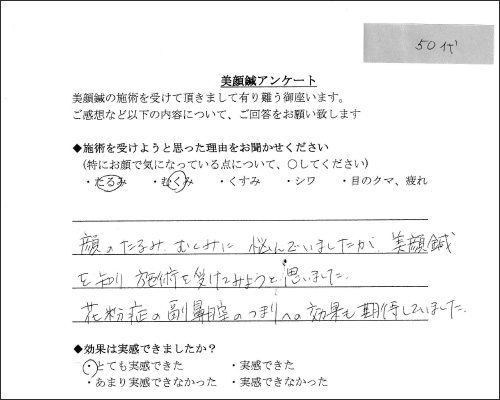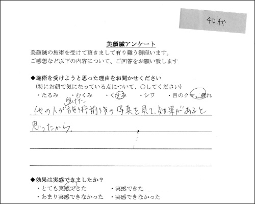 数年前から目の下のたるみと眉間のシワが気になっていて美顔鍼灸のポスターを見ていたら声を掛けて頂いて、最初は顔に鍼をさすのは怖かったけど、先生の丁寧な説明を聞いて施術を受けようと思いました。