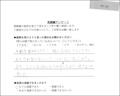 施術を開始して4ヶ月程経ちましたが、以前よりも顔のたるみが気にならなくなり、少しずつ効果が出てきていることを実感しています。目のクマも落ち着いてきたので、継続していこうと思います。