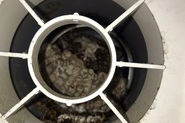 通気口内部に巣がある為、通気口を取り外し駆除を行い再発防止の為特殊金網を設置致しました。