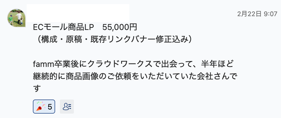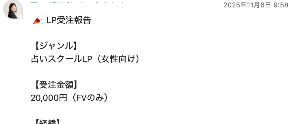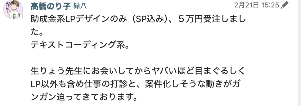 まだLP始めたばかりで、サポート3〜4ヶ月目にして5万以上で受注。