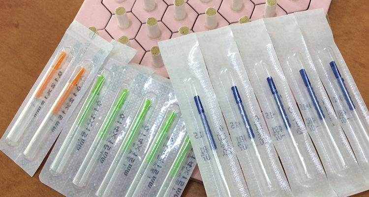 鍼の太さはわずか0.1mm程度で、女性の髪の毛とほぼ同じ。