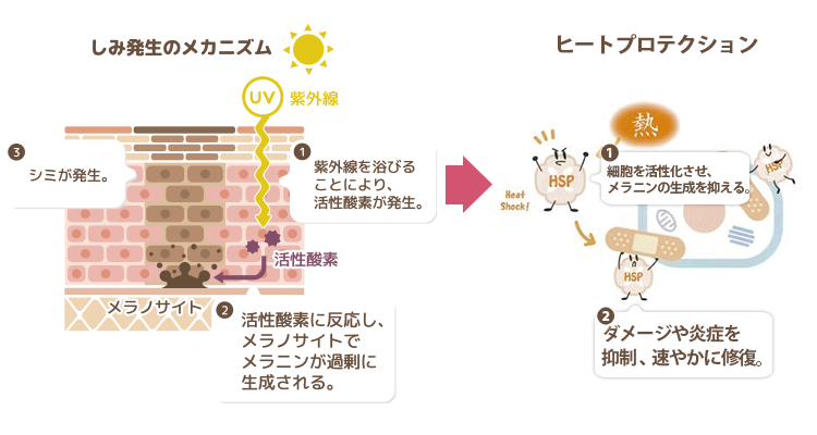 このHSPは紫外線などの熱ストレスを受けると、それに負けないように周囲の細胞を活性化させ、メラニンの生成を抑えます。もし紫外線によって細胞が傷ついてしまった場合には、そのダメージや炎症を抑制し、速やかに修復もしてくれるのです。