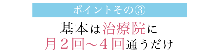 お肌の調子(ターンオーバー周期)が安定してきたら、2週に1回(月に2回)でも効果が持続しますので、お忙しい方でも安心です。特にお忙しいリピーターの方からも継続しやすいとお声を頂いています。