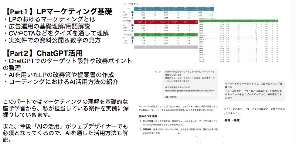 ✔︎LPを1〜10まで学べる→全てが実務的で取り組めば結果が出るような内容